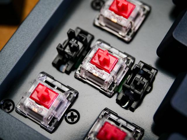G521作为入门级的三模产品,并没有使用成本相对较高的cherry轴,而是选择非常知名的国产轴体TTC轴。我是坚定的红轴党,所以毫无疑问也选择了TTC红轴,TTC红轴实际就是仿cherry红轴的设计,而TTC作为国内最大的轴体代工厂之一,其加工制造能力自然不会有任何问题,经典的设计+优秀的工艺,轴体手感应该不会差。