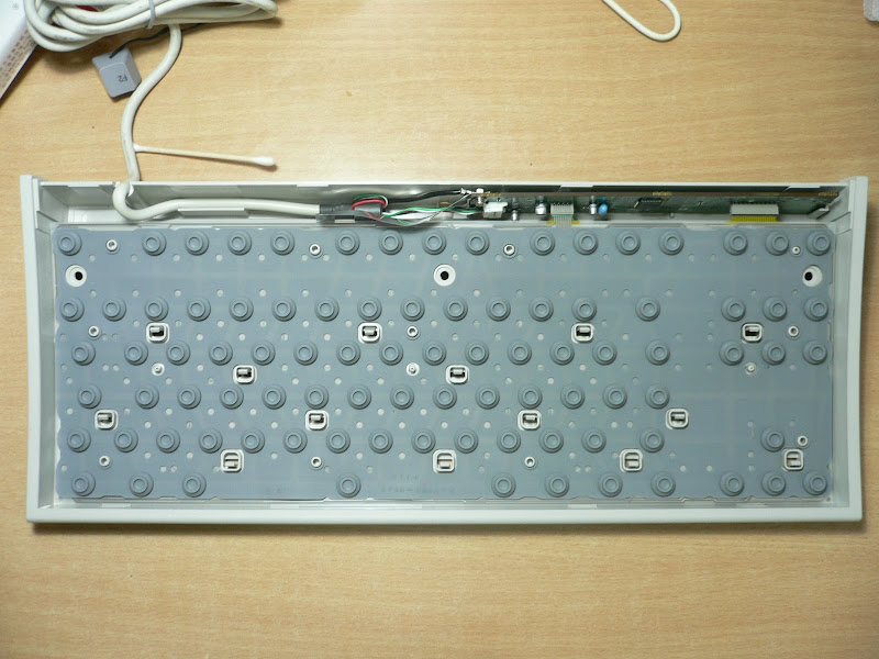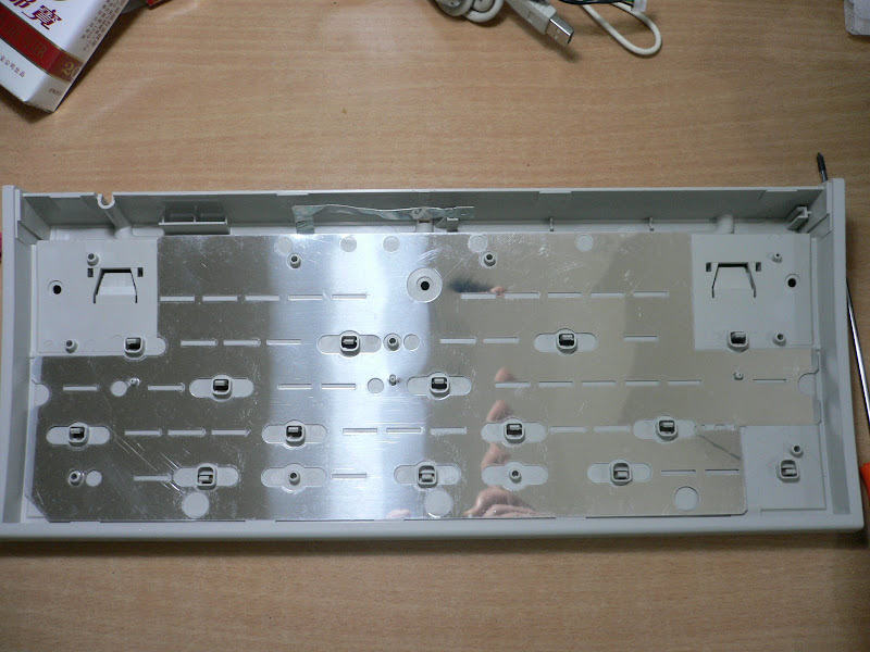 这是打开键盘,拆掉键帽部分的内部图,注意PCB安放的位置比较特殊竖着放的。