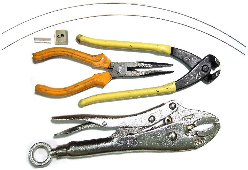 图02=用尖嘴钳将钢线折弯大约110度( 约等于键帽实际角度 ),先完成两个长约20 cm的U形线,
