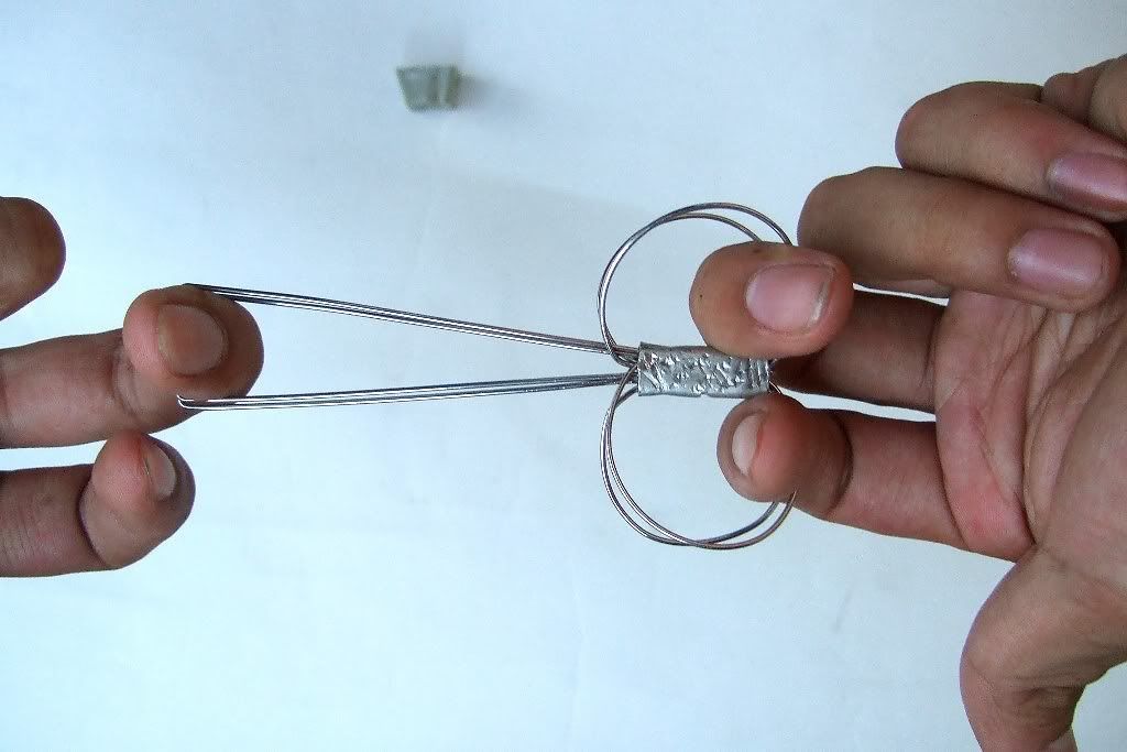 图06=一手平整固定U形(梯形)底端,再用尖嘴钳拉线尾来缩小圆圈