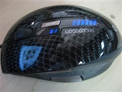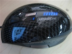 鼠标的左右键和背板为一体化设计,光滑且有反光,一排排十字星形花纹让人联想起赛车的碳纤维