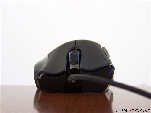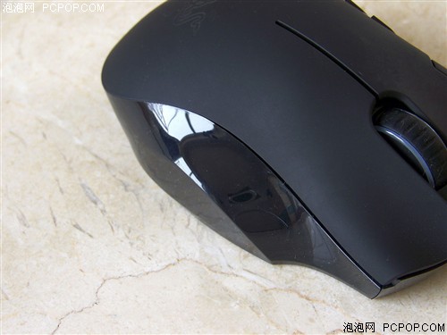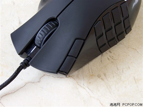 Razer那伽梵蛇游戏鼠标的左、右按键依然是表面带有凹纹的波浪形,并配置了表面有刻度线,滚动中分为24个段落的阶段感滚轮。另外,在那伽梵蛇左键旁的边框上,还有两个按键。