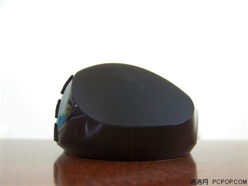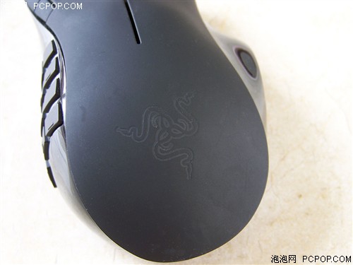 Naga那伽梵蛇游戏鼠标的“背部”,带有Razer的logo,这个logo,12个拇指键,以及滚轮在使用时都可透光,而且logo的背光依然是“渐明渐暗”交替的呼吸式。