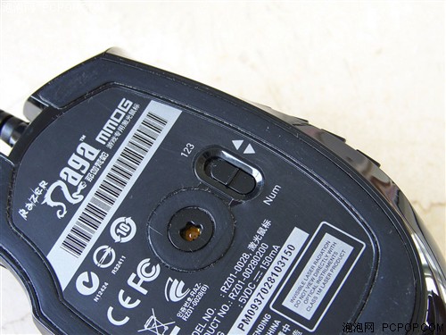 Razer那伽梵蛇游戏鼠标的底部配备了“一圈”一体式的特富龙垫脚,这对于保持鼠标的平滑快速的移动更加有利。另外,Naga游戏鼠标的底部还有一个“123/Num”拨键,可以切换12个拇指键的工作模式。