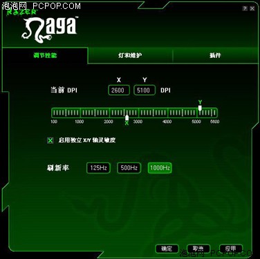 Razer那伽梵蛇游戏鼠标的驱动设置界面由三部分组成,第一部分是鼠标的分辨率、报告频率的设定,那伽梵蛇的分辨率可在100-5600dpi间,以100dpi为最小单位自行设定。而那伽梵蛇的报告频率可在125Hz、500Hz、1000Hz三档中设定。