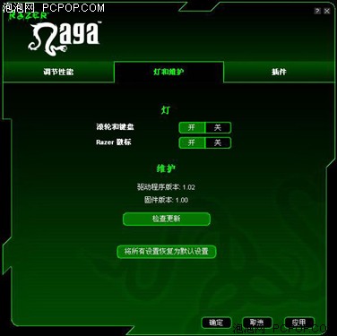在驱动界面中,还可以设定那伽梵蛇滚轮、拇指键灯光的开/关,以及logo背光的开/关。