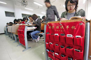 近日,为改善课堂“低头族”状况,北京农业职业学院推行了“课堂无手机”活动,要求学生课前将手机上交至36格“手机保管袋”,下课取回。昨日下午,该校宣传教育科负责人回应,强制推行“课堂无手机”是为了改善不良课堂秩序,同时也会要求授课教师提高教学质量。同时全国的多个地方高校都同时实施课堂无手机活动。