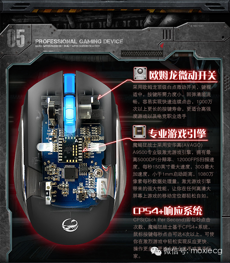 狂战士是魔蝎军团的顶尖战士,每名狂战士都经历了漫长岁月的近身格斗、战术指导、忍耐力训练以及军事纪律教导。为了捍卫战士的荣耀,他们将自己的一生投入到追求万门的战斗技巧的过程中去,拥有令人畏惧的体格,装备高科技能量装甲,并持有纯灵能的刀刃。他们有着对战斗的狂热及摧毁眼前一切敌人的执着,是战斗中凶悍战斗力的直接体现。 魔蝎顶级竞技游戏鼠标狂战士,专为RTS游戏高强度职业电竞玩家设计,结合人体工程优化,配置安华高A9500专业级激光引擎,69克轻巧灵动,CPS4+响应系统,最高5000DPI,更适合大神级游戏操控。