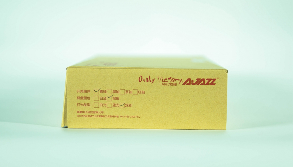外层包装采用瓦楞纸包装,正面印有品牌logo和产品宣言,并配贴有防伪码。 黑爵AK33s外包装侧面