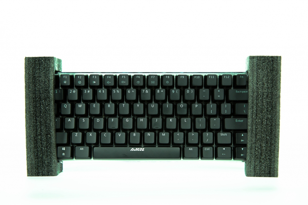 内盒包装内部两端使用泡沫衬垫对键盘进行加固保护,并且在键盘上套有白色泡沫膜。(用了几天不知道膜扔到哪了。囧)