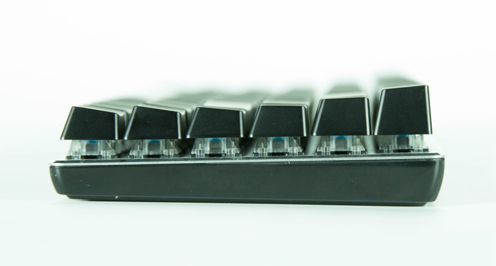 另一个体现出精心设计的地方就是大写锁键,在大写锁键旁边有一盏蓝色的灯,亮度略高于其他部位,作为大写键的指示灯,因为亮度高,所以即使在开启的时候也能清晰看到。这点确实用心了,在单色背光的键盘中,有一个很重要的问题就是,灯光开启中,很难确定自己是否开启了大写锁键,通过这一个简单的设计就完美解决了,键盘的设计者确实用心了。
