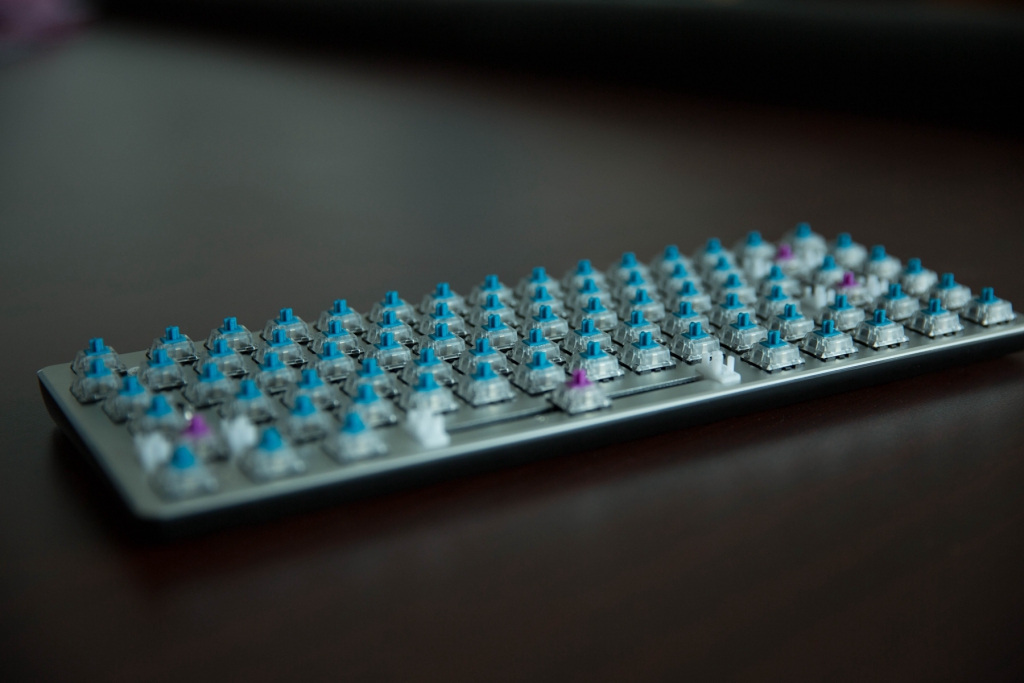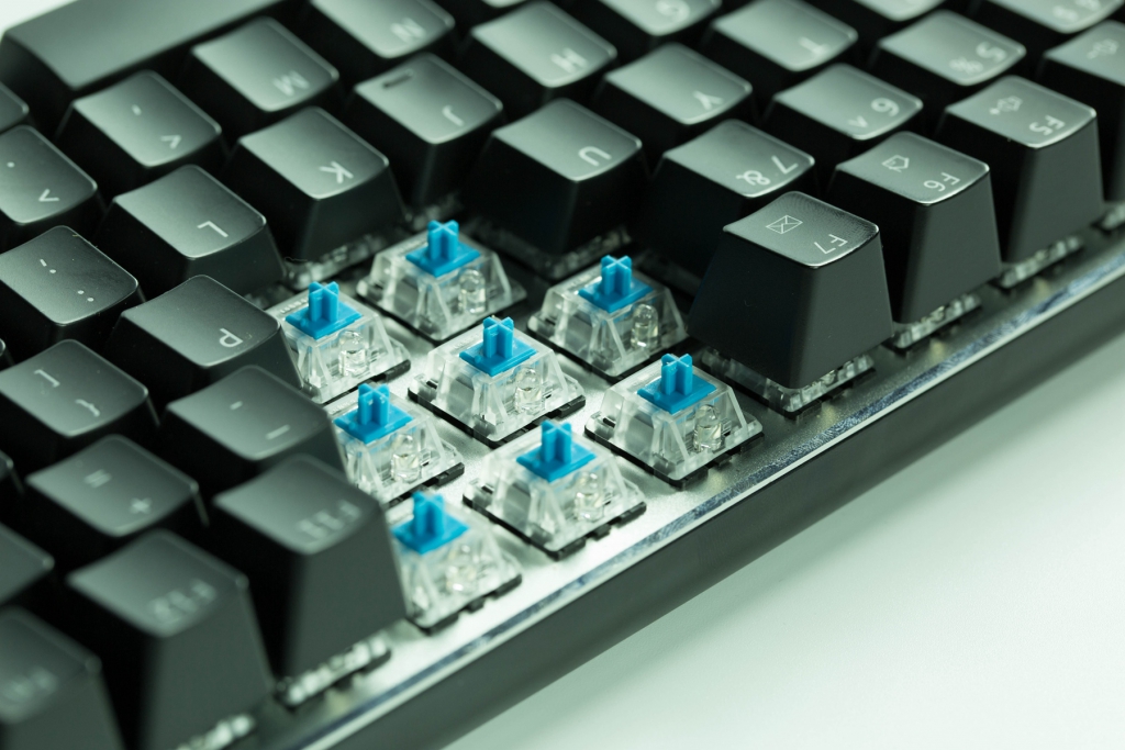 键盘采用race配列,82键短小精干,无上盖设计。ESC,dele等按键采用特殊设计,一定程度上减少了因为F区与数字区没有间距而产生的误按。