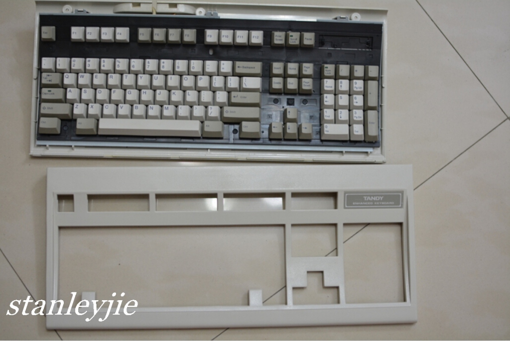 好久没写老键盘了,琢磨着以后写的可能性也越来越小,趁着晚上心情好赶紧拆一把。 这个是两年前入手的一把老键盘,tandy定制键盘,富士通代工,ibm屈蹲弹簧式结构,成色非常好,一个大神跟我透露ylj商刚进了这么一个货,还未上架,我赶紧抢着买下。 老键盘我衡量它价值一般介于下面几点, 一、稀罕程度 二、手感 三、成色 四、做工 像上一把alps粉红轴键盘,就满足了以上1,2,4个条件,dell代工的alps轴键盘很多,但淘宝上能看到的都是黑轴,粉红轴很少见,而且产地也不一样,做工也更好,alps轴的手感不用多说,也是我喜欢的,缺点就是成色有点差,所以只好买回来清理补救。 而这把tandy标键盘,看介绍,是完全符合我的4点要求的。Tandy定制键盘据说老键盘市场不多见,做工不同于常见的富士通4725,据大神说那是杠杠的,富士通代工的那种屈蹲弹簧式结构键盘,满满的机械敲击感,更是我的最爱,最后最重要的就是成色,虽然不是盒装,但是表面还是带覆膜成色据说几乎全新。
