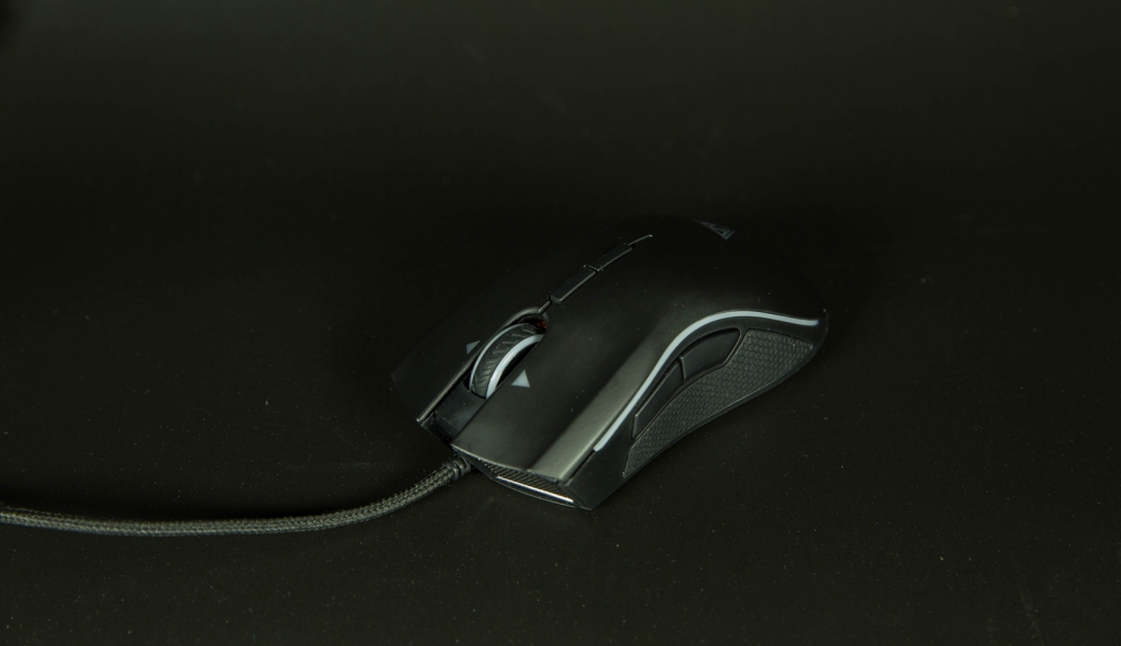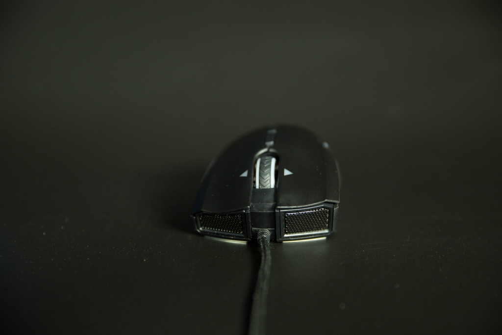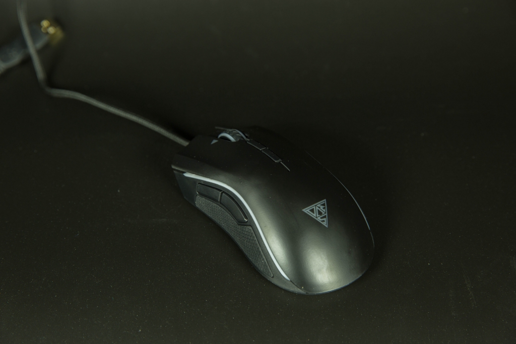 表面用的磨砂材质,RGB(34, 34, 34)">鼠标左侧带有两颗侧键,侧裙采用双注塑+防滑颗粒处理,防滑效果不错,手感整体上复制的不错,很接近曼巴。