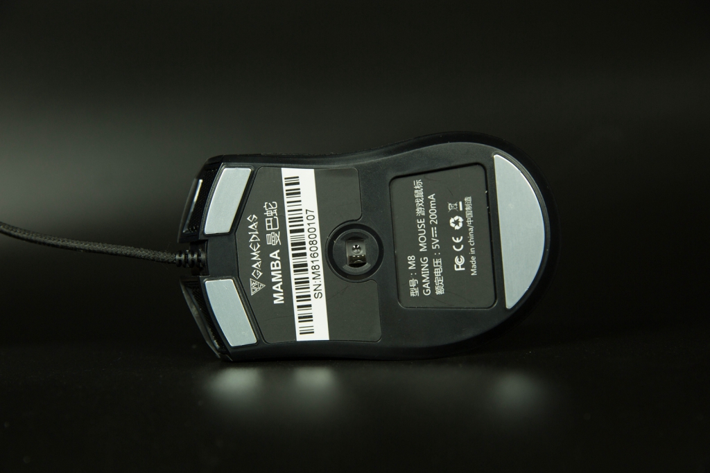 线材采用的是编织线,带有理线带,抗干扰磁环,镀金接头。还不错。 多说一点的就是滚轮,滚轮的手感调教的相当和以,一般百元鼠标很少能见到手感不错的滚轮。阻尼,刻度感都不错. 底部贴纸有SN码,产品信息什么的。比较特别的就是用的不锈钢脚垫,相当顺滑,实际使用当中,即使在皮质鼠标垫上也毫无阻塞感。 驱动
