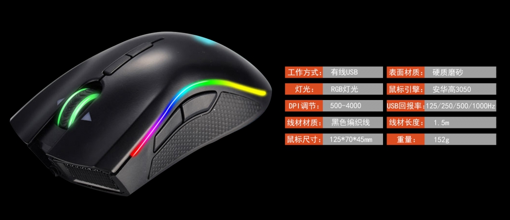 先看下参数,用的3050芯片, DPI500到4000,感觉完全够用了,最起码我最高也只用到2300.