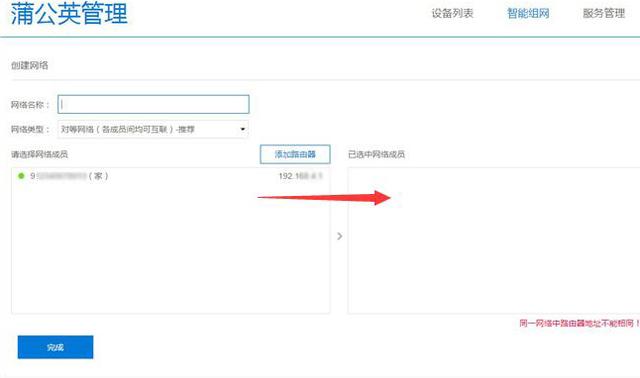 接下来填写所要组建网络的名称,然后把需要组网的蒲公英设备勾选到“已选中网络成员”框中(本次组网只用到了一台蒲公英X5路由器);值得注意的是,组网的蒲公英设备Lan口IP网段不能一致,否则无法提交成功。 三、智能组网中添加“访问者”服务