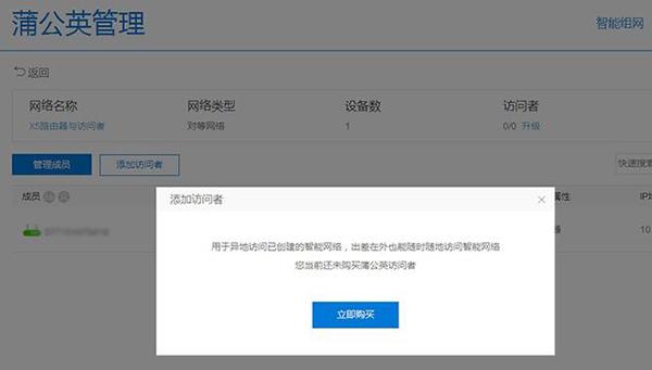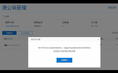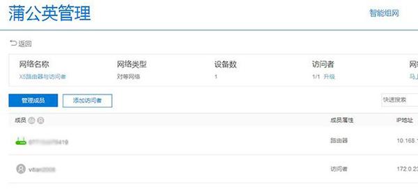接下来我们体验一下“访问者”,即便是只有一台蒲公英X5路由器也可以搭配“访问者”使用。把蒲公英X5路由器拉进这个网络,再添加“访问者”进来就可以了。