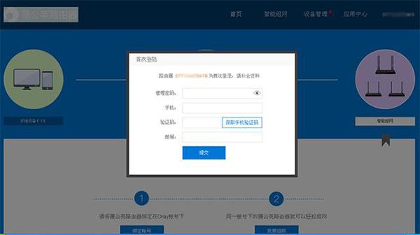 蒲公英X5路由器首次联网,我们进入系统登陆界面后便会提示初始化的设置对话框,并且需要短信验证作为安全控制,也方便日后修改、找回密码。SN码印在机身背面,作为登陆名使用。