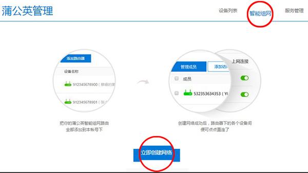 在弹出的对话框中填写蒲公英的SN码和设备名称,确定提交之后进入组网界面,点击 “智能组网”--> “立即创建网络”。