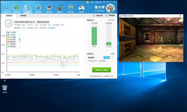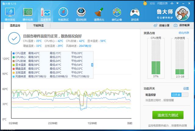 通过鲁大师进行温度压力测试,CPU最高温度也只达到过56摄氏度,可见爱国者的散热性能还是相当不错的。