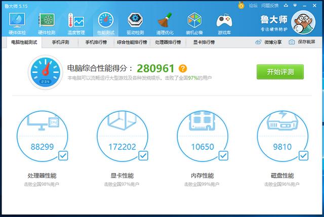 鲁大师跑分280961,击败了全国97%的用户,从击败全国百分比用户来看,处理器、显卡、内存、磁盘性能搭配都还算均衡,都超过了95%的全国用户水平。 小结:对自己狠点果然很爽,游戏平台升级之后性能便水涨船高;整套配置下来,感觉很满意,不知道大家觉得如何?有什么建议么?