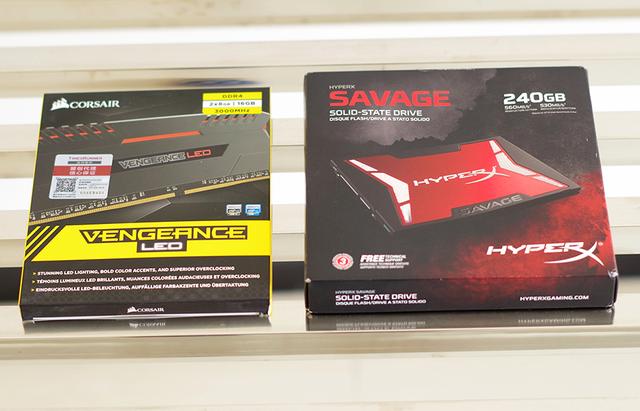 海盗船出品的复仇者红灯条 DDR4 3000 8GB*2条,人送外号“红梳子”,这与显卡、主板的色系走到了一条裤子里面,虽然内存的价格一直在涨但是仍然对它下手;金士顿 HyperX Savage 240GB SSD,感觉会LOW么?有钱了再升级到东芝 Q300PRO 256G会不会更好,装机看看表现再说罢。