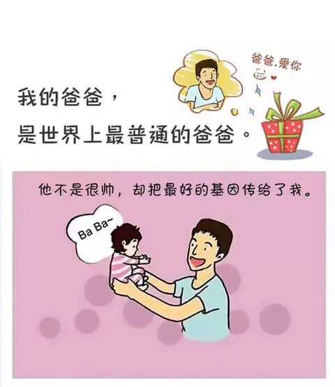 爸爸是我眼中的超人, 有他在, 我就什么都不怕; 小时候, 爸爸的肩膀是离天空最近的地方, 踩着它, 我就能站得更高看得更远; 小时候, 爸爸是我的人工导航仪, 有了他, 我从来不需要认路 ... 其实, 我的爸爸, 只是世界上最普通的爸爸。