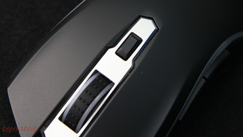鼠标的滚轮采用的是白色透光塑料材质,中间则采用一圈黑色凸点橡胶带,增加摩擦感。DPI按键则为单颗黑色按钮设计,通过循环切换设定当下DPI值。整个滚轮区域的采用了雷柏标志性的V型磨砂金属饰条,并且在饰条周围都有进行一个CNC切边处理,
