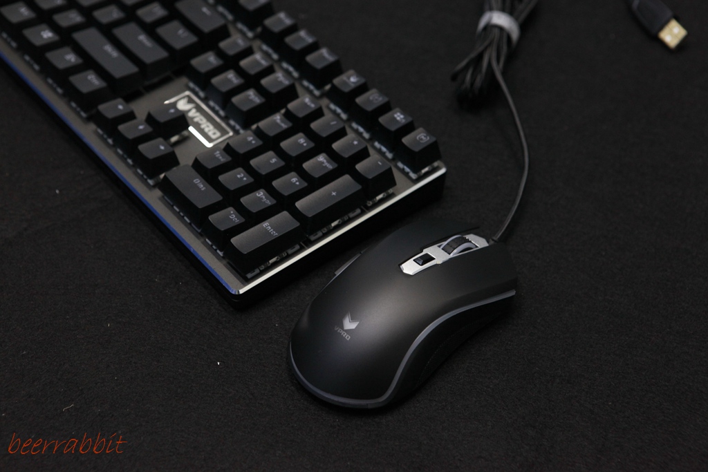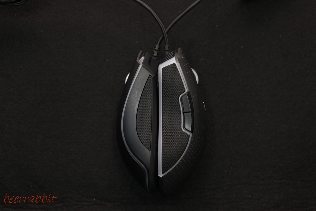 鼠标右侧两颗侧键位置比较合理,位于拇指上方,误按的几率比较小。另外侧裙的防滑橡胶采用二色注塑工艺,优点是牢靠不容易掉。