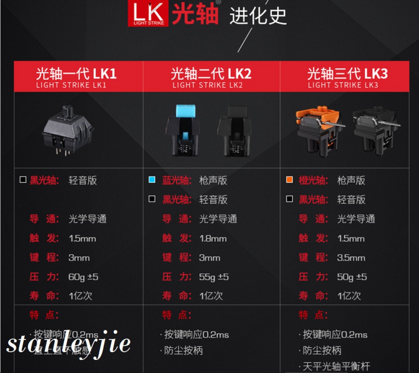 血手早在2013年申请了光轴专利并应用在自家的键盘B700,B720,B740上面,经过这些年的发展,光轴从光轴1lk1,发展到光轴2lk2,再到最近新出的光轴3lk3