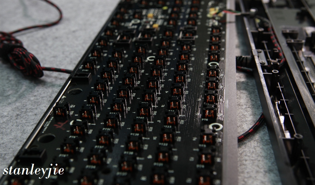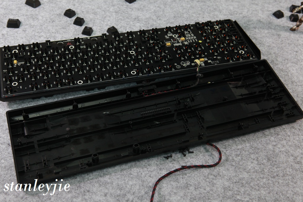 对于一个卖499的产品,拆解看做工是很有必要的。而对国产键盘的印象,我最近最大的体会就是,先不说做工好坏,拆解是越来越困难了,b975不但用了两种不同类型的螺丝,还在键盘背面对着空格的位置藏了两颗螺丝,不要说拆解,玩家如果想换键帽的话都得把保修贴破坏掉才能更换,这点我是持反对态度。