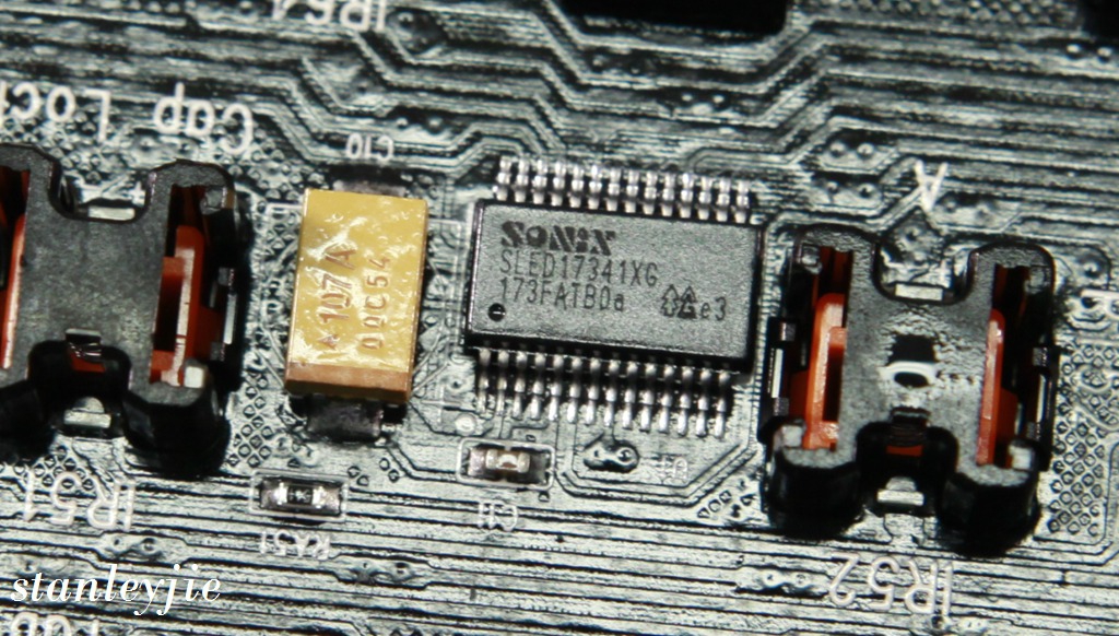 ▲芯片采用采用两枚sonix松瀚,SLED17341xg的芯片,跟P93鼠标的芯片一样,应该是控制背光的。