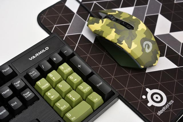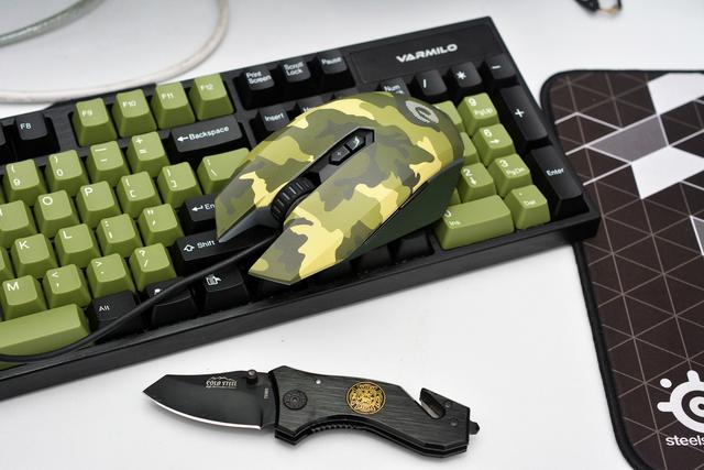 然而,这个套装并不是来自同一个厂商,鼠标是达尔优EM915迷彩版,键盘是阿米洛VA104M。迷彩的鼠标,搭配军绿配色的键盘,层次分明。