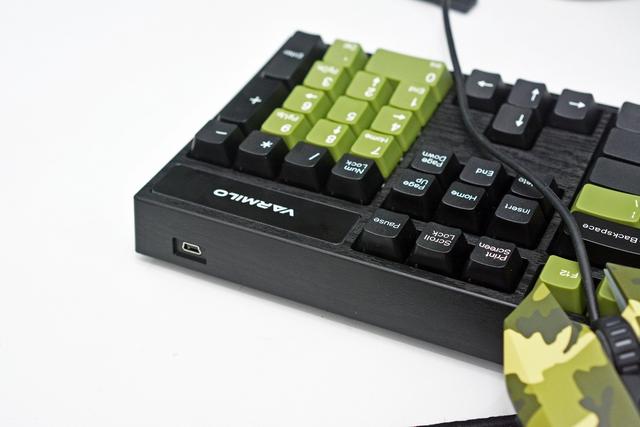 键盘上盖为木纹质感,右上角LOGO处为黑色金属,再配上军绿键帽,这种特别的味道不是什么键盘都有的。