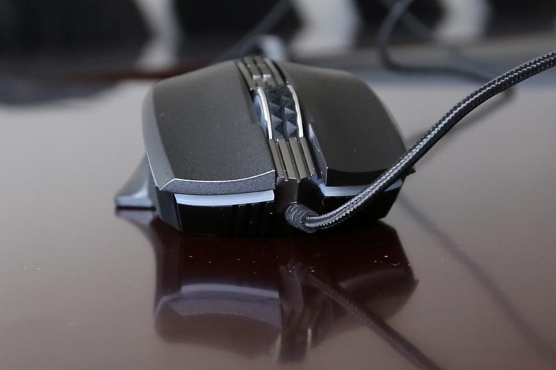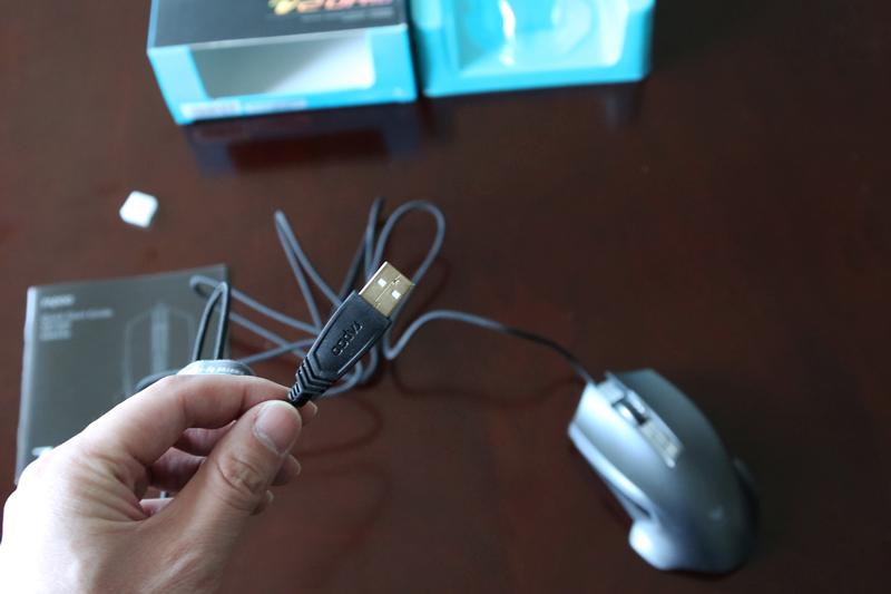 采用国产游戏鼠标一贯的镀金 USB 接口、编织线缆,但缺少了屏蔽磁环,要批评一点的是这个编制线真硬,最好配合线夹使用。