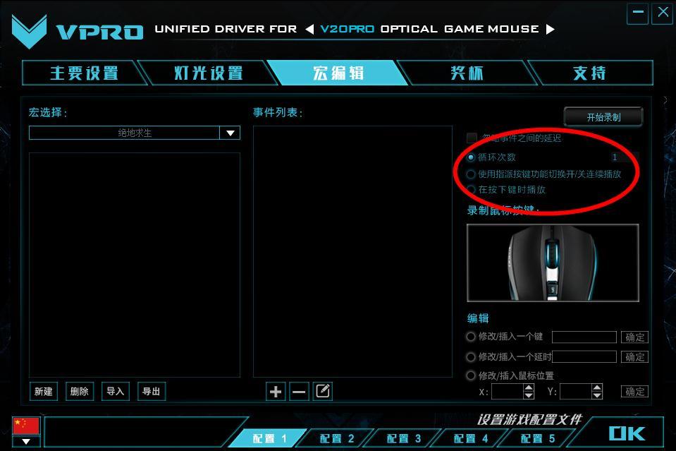 宏编辑选项丰富,提供了多达 21 个游戏预设宏命令包,但是绝地求生貌似还不支持,里面是空的,宏功能很完善,可以自己编辑宏命令,录制宏,可设置循环次数,循环方式等。