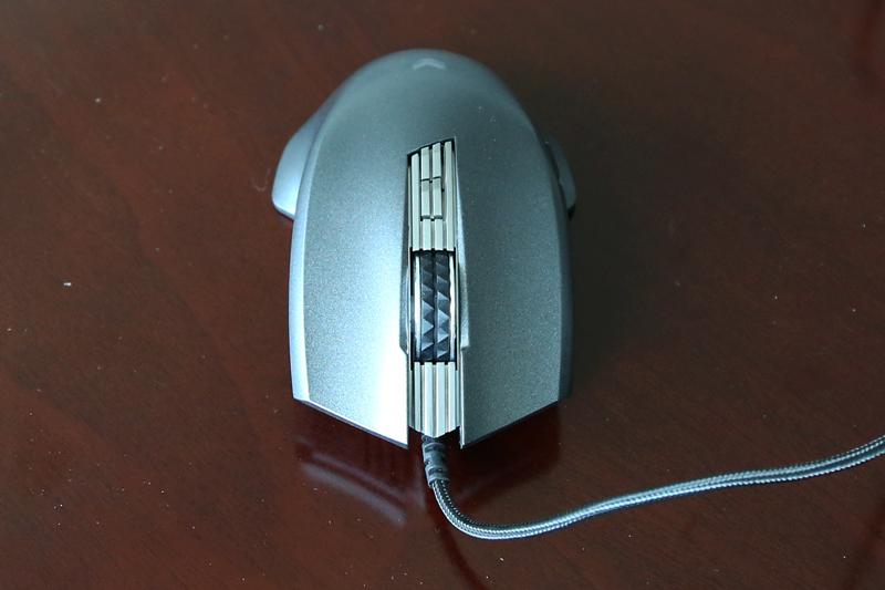 钻石切割线条沟壑覆盖整个滚轮和 DPI 加减操作区!看起来挺高端的!实际上滚轮采用的是金属圈材质, dpi 操作区是银色塑料。