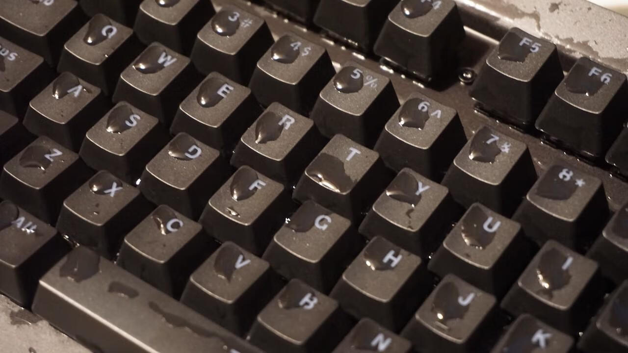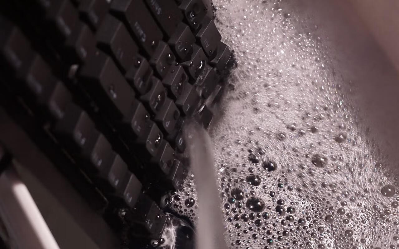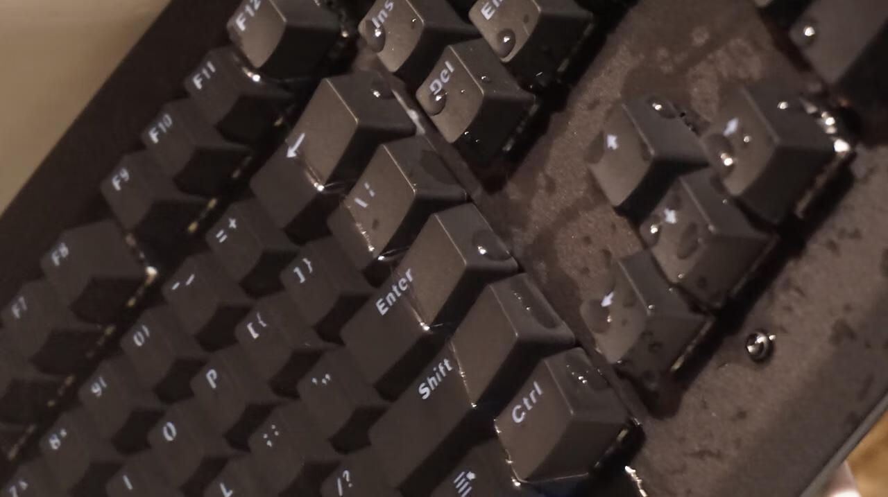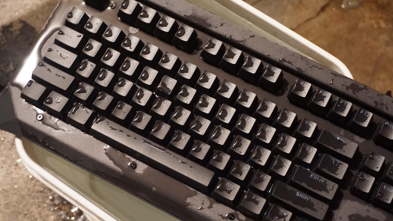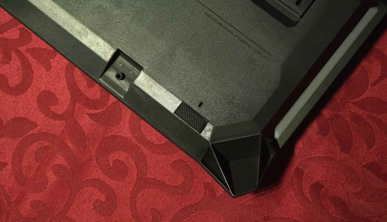 键帽采用ABS 材质双色注塑而成,字符开口设计,键帽的塑料颗粒感有些厉害,下沿边缘也又丁点的毛刺。 背面底座是塑料壳,从背面可以看到两侧各有两灯条,除了一般键盘配备的支持脚防滑脚垫外,还设计有几个排水孔,进水后方便漏水。 雷柏v750的灯光是单色红光,红黑配色一直都被认为是经典配色,比较讨玩家们喜欢,但毕竟单色光看上去还是比较单调了,没RGB幻彩那么酷炫。但看雷柏v750算是中规中矩的,晚上打字照亮的功能还是有的,但灯光不足的地方应该是两侧灯条和雷柏logo 部分的灯光看着不是很均匀。 最后作为一把防水键盘必须要经过水的洗礼,自己把键盘放在水桶里,基本上大半个键盘都已经浸在水中,里面PCB板轴体肯定也都进水了。然后把进水的键盘淋干,一直凉着让他自然干,最后个天试用键盘已经可以使用,各项功能都正常,实验结果可见雷柏v750的防水效果确实是可以的,IP68级的防水确实厉害。