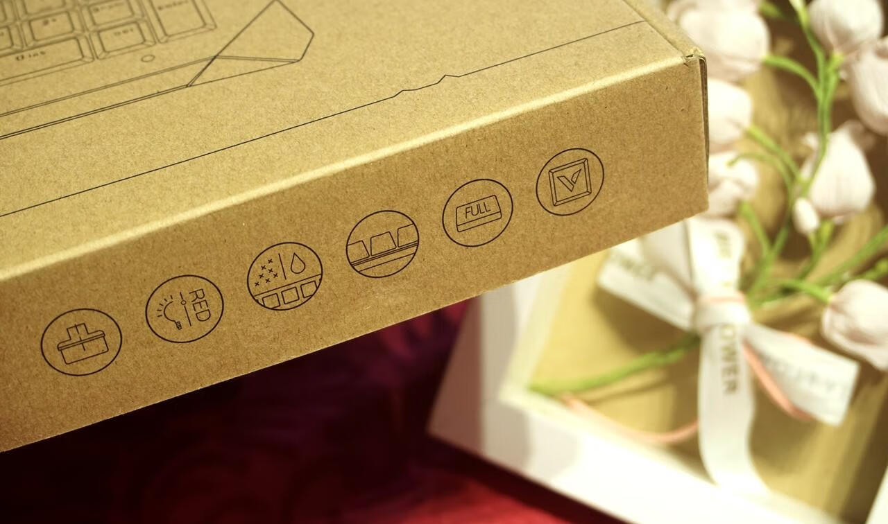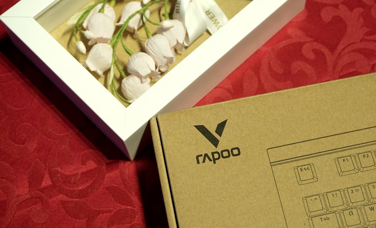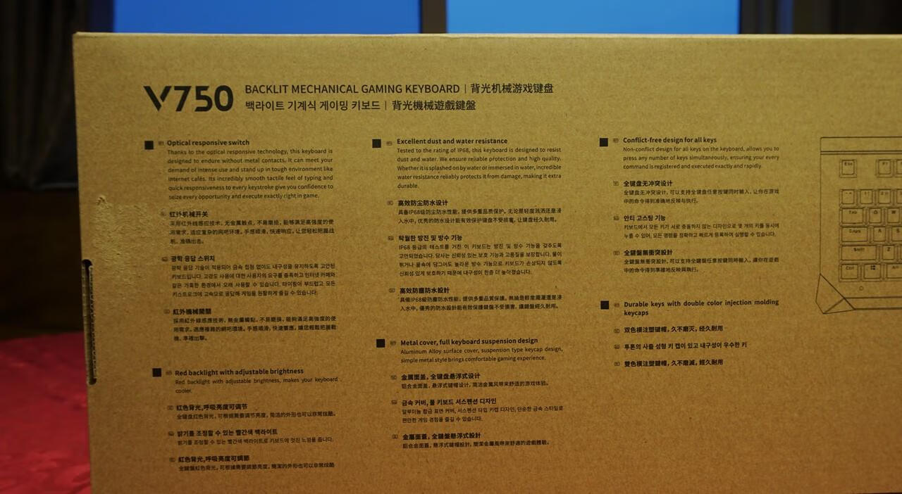 包装部分算是雷柏V系列外设的一贯风格吧,牛皮纸硬纸盒,正面都是产品素描图案,背面各种语言的键盘特色介绍,区别于其他机械键盘的最大特点就是防水防尘功能,这也是众多机械键盘不具有的特点。附件就是一张键盘使用指南说明书。
