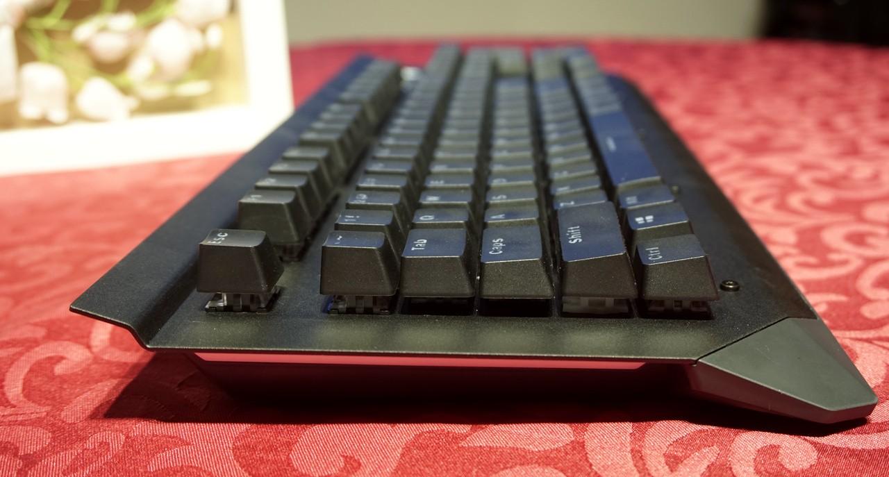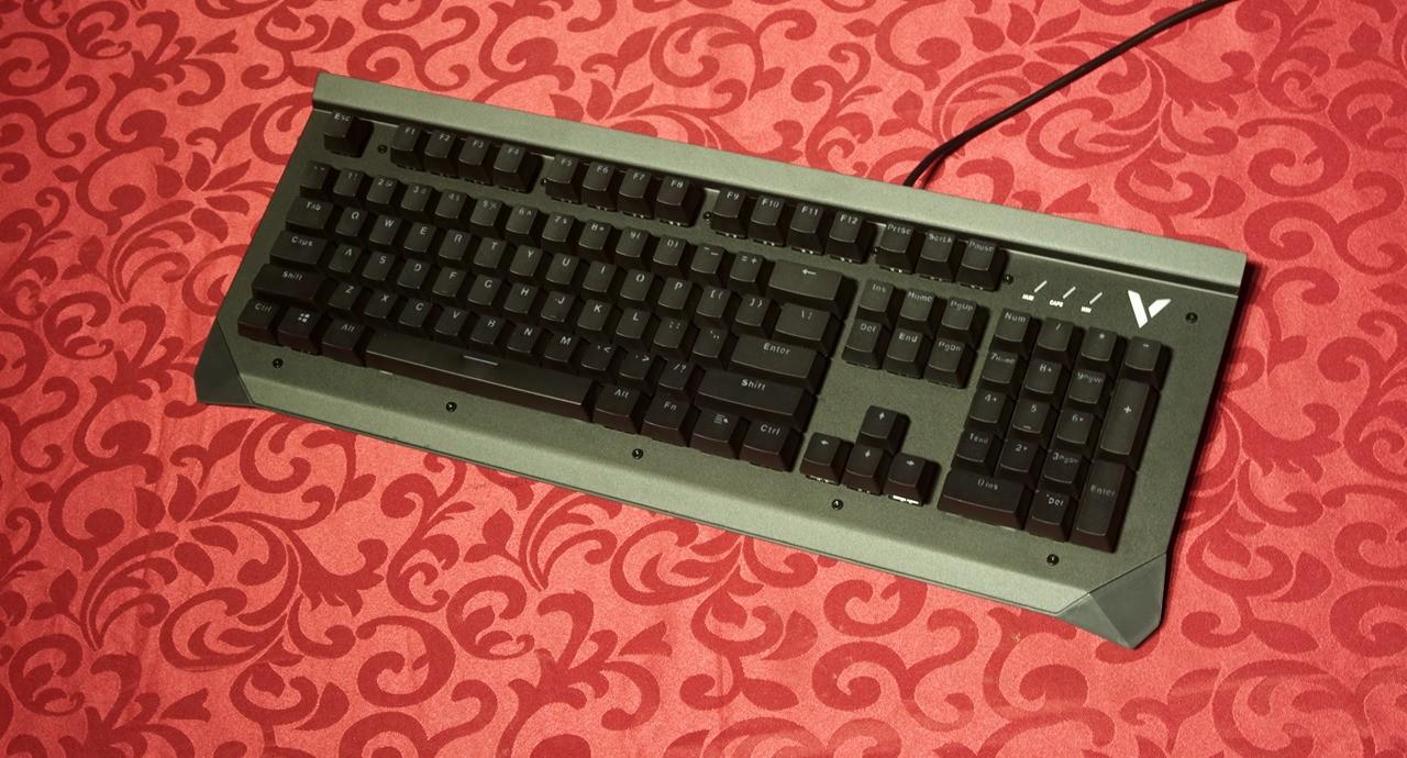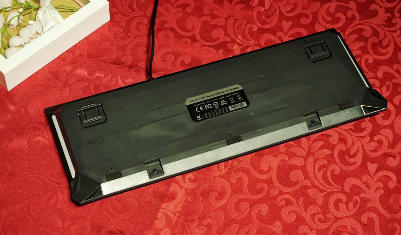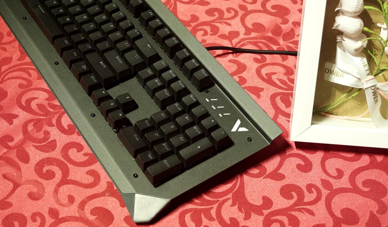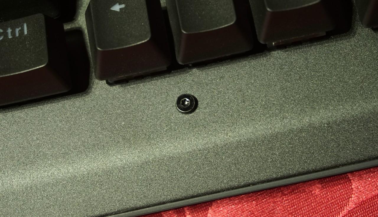雷柏v750键盘给人第一感觉就是造型有点海盗船的血统,键盘上沿凸出的面板跟海盗船键盘有些相似,但不同的是键盘凸起的地方也只是金属面板做了90°的弯折,而海盗船是全封闭的键盘上沿,这样凸起设计可以在键盘上放个手机,还挺不错。 雷柏v750使用标准美式104键位布局,悬浮式按键设计风格,上面板为黑色金属合金面板,底部外壳工程塑料,上下使用金属螺丝固定,面板上面外漏的螺丝铆钉都可以看到。光看键盘感觉面板的金属感还是很强烈的,金属面板的表面还不能像塑料外壳那样细腻,看上去有些金属喷砂的颗粒感。