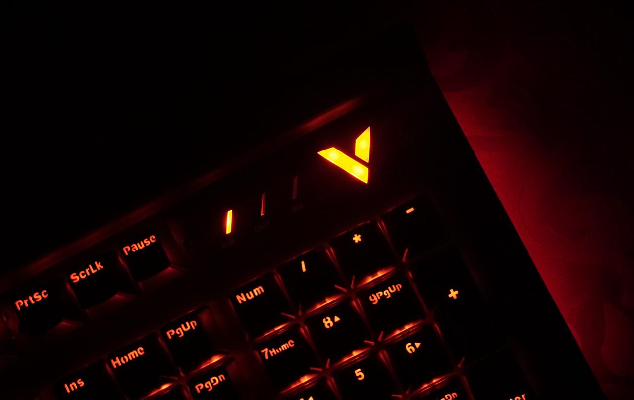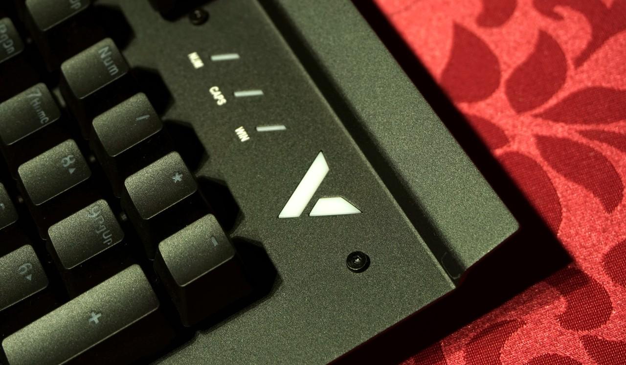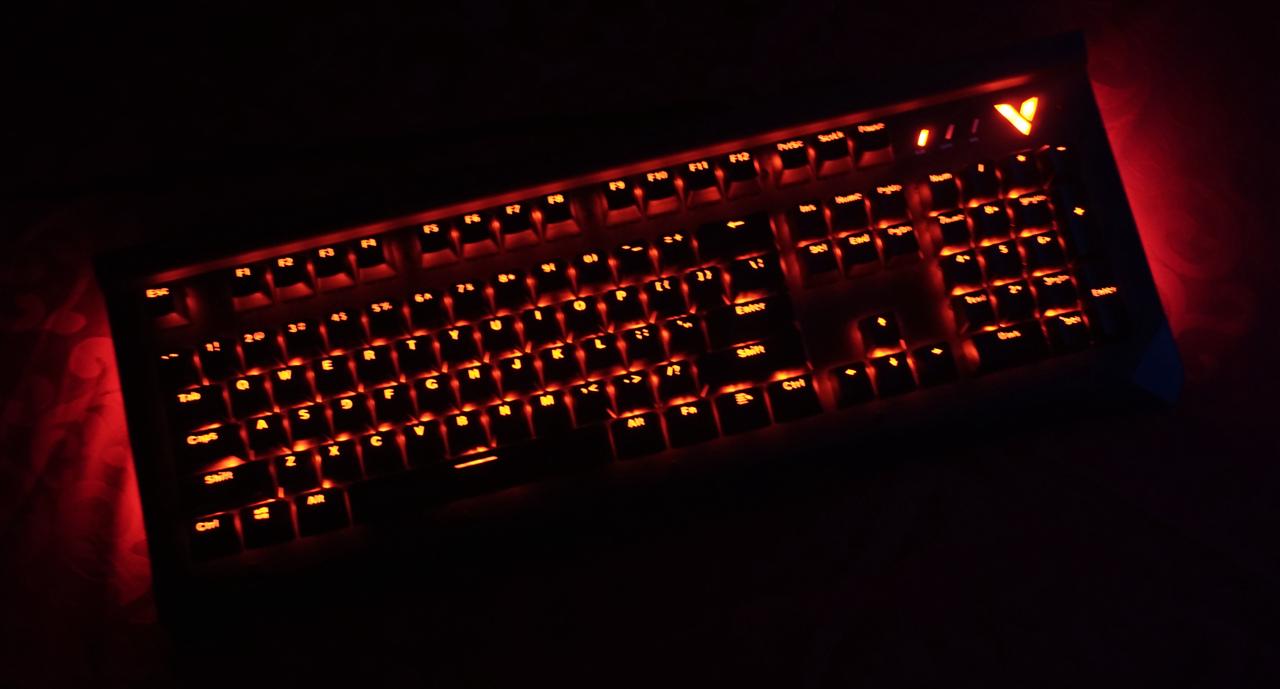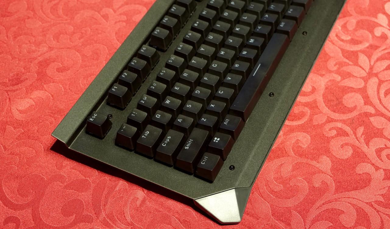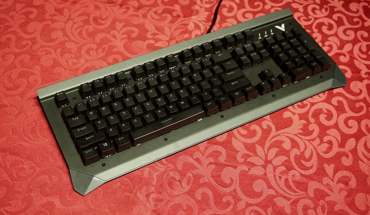 雷柏v750键盘给人第一感觉就是造型有点海盗船的血统,键盘上沿凸出的面板跟海盗船键盘有些相似,但不同的是键盘凸起的地方也只是金属面板做了90°的弯折,而海盗船是全封闭的键盘上沿,这样凸起设计可以在键盘上放个手机,还挺不错。 雷柏v750使用标准美式104键位布局,悬浮式按键设计风格,上面板为黑色金属合金面板,底部外壳工程塑料,上下使用金属螺丝固定,面板上面外漏的螺丝铆钉都可以看到。光看键盘感觉面板的金属感还是很强烈的,金属面板的表面还不能像塑料外壳那样细腻,看上去有些金属喷砂的颗粒感。