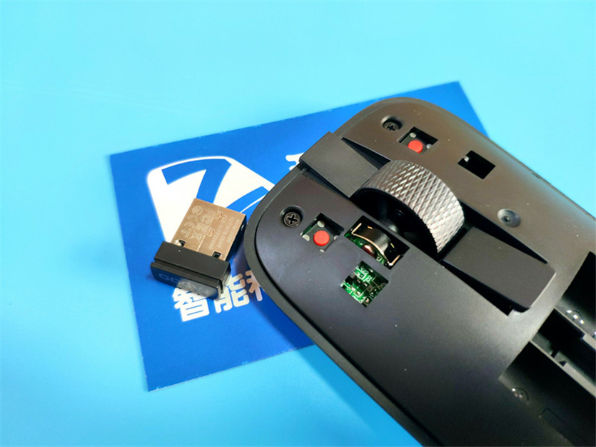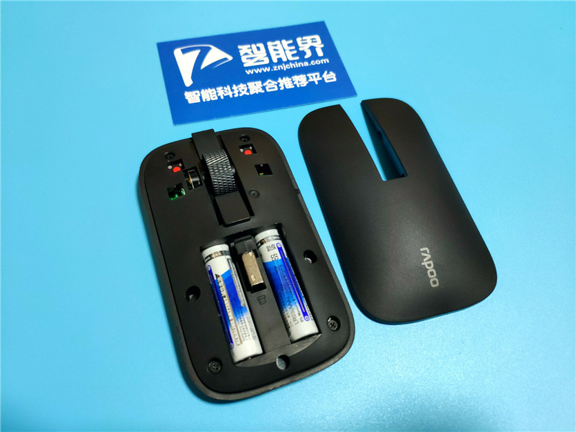 除了电池仓外,我们还可以看到其内部放置有一个小巧的无线接收器,这样的设计令我比较惊喜,便于收纳其不易丢失。雷柏M550之所以称为多模式无线鼠标,使用为其除了无线2.4G模式外,还支持蓝牙3.0和蓝牙4.0两种模式,可以同时实现三台设备连接,并且可以在三台设备间快速切换,使得办公更加灵活,效率更高。