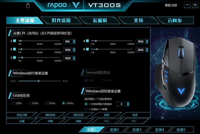 可以调节指针速度回报率以及滚轮速度自定义按键等。