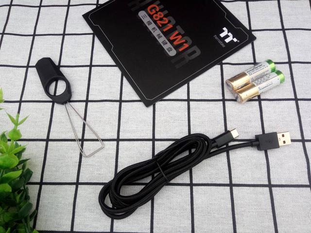 包装盒内配件比较简单,除了TT G821键盘,配置了USB连接线、电池、拔键器和说明书。Type-C连接线不是很柔软,有些硬,方便固定线型,长度有1.5m,适合玩电竞游戏时或无电池状态下使用。