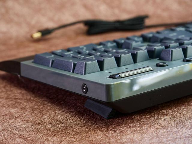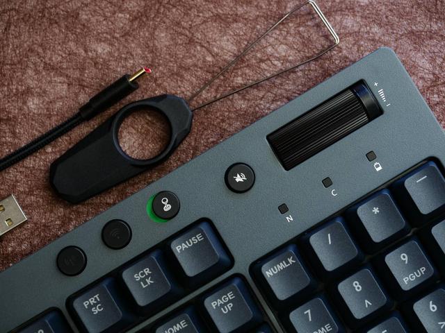 功能区都放在了右上角,4个圆形按钮依次是 WIFI和2.4G开关,以及游戏模式(锁win)的拨动按键,并且有明显的红绿色区分,这样可以让用户非常明确当前的状态。一键静音和大大的音量调节滚轮在最右边,相比那种需要组合键一下下调整音量的方式,滚轮确实舒服和方便很多,当然代价是键盘需要做得更大,但作为一个桌面上可以多设备切换的键盘来说,我认为还是值得的。