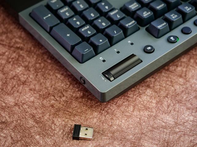除了键盘本体外,包装里还包括2.4G接收器一个,USB to Type-C编制线一根。设计感不错的拔键器一个,甚至还有2个超霸5号电池。以及一本简单的说明书。