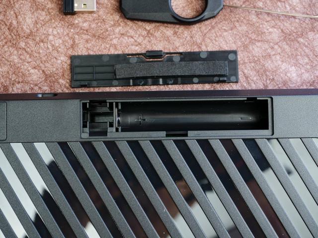 续航方面,G521并没有采用充电设计,而是更为传统的2节5号电池的方案,电池仓盖有海绵垫避免电池意外脱落,还有收纳2.4G接收器的地方,细节很到位。