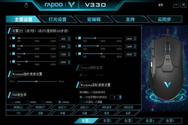 在“主要设置”中可以对鼠标灵敏度的DPI值进行等级设置,提供有200-6200的7个档位可选,还能对鼠标移动速度、滚动速度等进行设置,灵活性比较自由,适合不同环境下的使用需求。