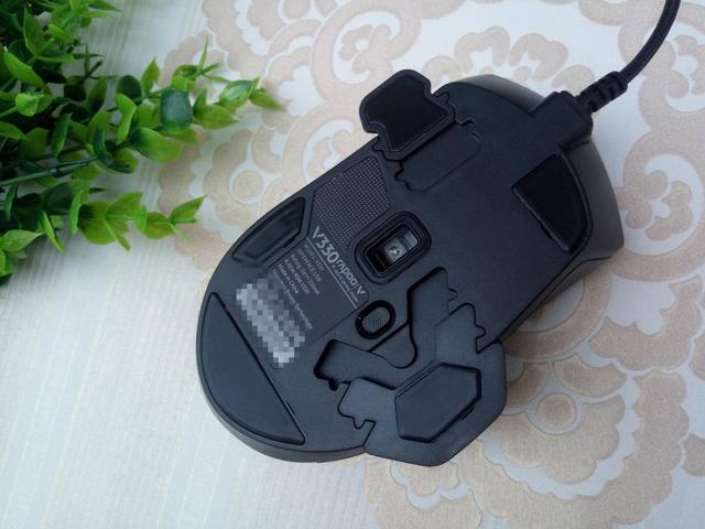 底部有中间是光学传感器,周围分布着5片脚贴,能增加鼠标的耐用性,也能保持鼠标滑动时的流畅度。其中左右两块脚贴可以拆卸,采用了自由拓展设计,能进行4种造型拓展,通过磁吸和卡扣固定,这是雷柏V330最有个性的设计。